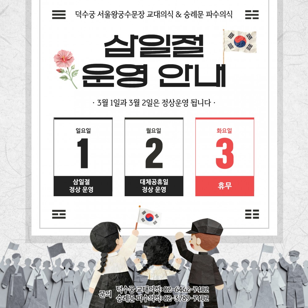 덕수궁 서울왕궁수문장 교대의식 & 숭례문 파수의식 삼일절 행사 운영 안내